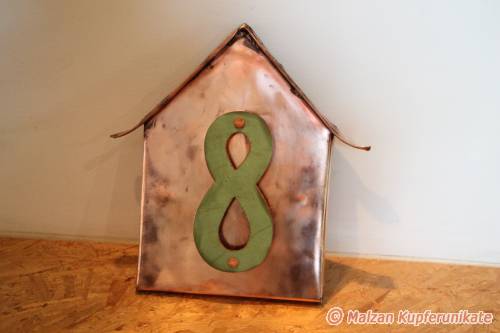 Hauses in Kupfer mit angedeutetem Reetdach. Die Zahl ist aus Patinakupfer.